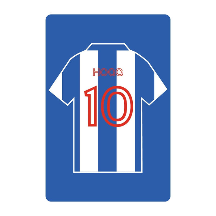 Create a personalised football shirt sign blue and white town online. This version is designed for fans, with the historic blue and white stripes, and can be customised with the player name and number.