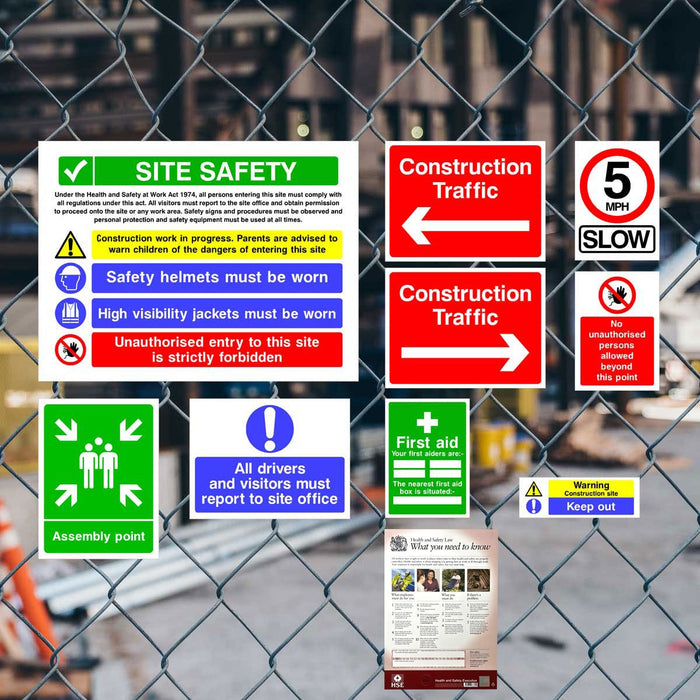 Ensure top-tier construction site safety with our best‑selling 11‑sign pack + HSE poster — designed specifically for UK building sites and fully compliant with the Health and Safety (Safety Signs and Signals) Regulations 1996. This high‑visibility multi‑pack includes mandatory, prohibition, warning, safe‑condition and directional signs, plus a clear HSE Health & Safety Poster to reinforce awareness and staff training.