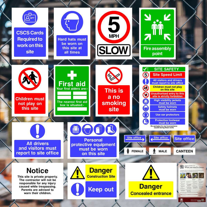 Essential for UK construction and building sites under CDM 2015, the Pack G range covers all critical signage: from hard‑hat and PPE notices to speed limits, hazard warnings, emergency exits and site rules. Ideal for hazard communication, directions, and mandatory instructions, it helps employers comply with the Health & Safety at Work etc. Act 1974 and The Management of Health and Safety at Work Regulations 1999.