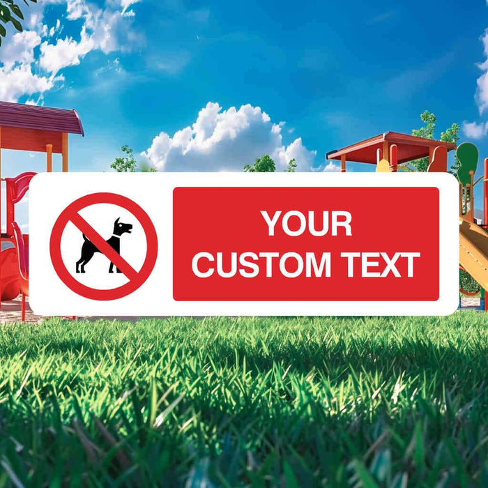 Personalise this no dogs prohibition sign with the message of your choice. We'd recommend a bold white text or a light coloured font. This sign is landscape sized.