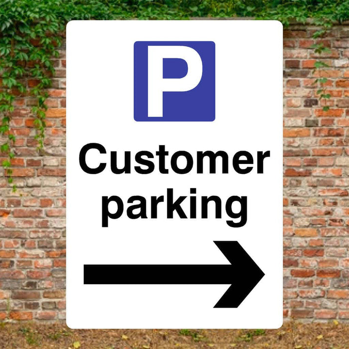 Ensure smooth access for your customers with this Customer Parking sign featuring a bold right arrow. Manufactured from tough, weather-resistant materials—choose from 3 mm recycled plastic (Palboard) or composite aluminium—this sign guarantees long-term visibility. Ideal for outdoor use, it complies with TSRGD (Traffic Signs Regulations & General Directions), utilising the standard blue 'P' parking symbol to meet UK safety legislation.