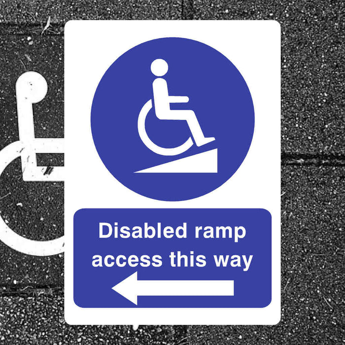 Guide visitors safely with this Disabled Ramp Access sign – left arrow, a vital addition to your access signage suite. Manufactured in the UK to withstand indoor and outdoor environments, this sign ensures clear directional guidance to wheelchair ramps. Featuring the internationally recognised ISO 7010 wheelchair pictogram and left-pointing arrow, it supports compliance with the Equality Act 2010 and aligns with HSE best practices for accessible routes. Ideal for businesses, public buildings, schools and healthcare facilities, the rigid plastic or aluminium options resist fading and UV exposure. Quick to install with pre-drilled holes or self-adhesive backing, it helps maintain safety and accessibility standards while enhancing property inclusivity. Elevate awareness and ensure route clarity for disabled users—an essential wayfinding solution for modern premises.