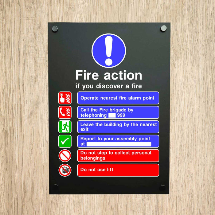 This Fire Action 999 Sign Black is part of our premium Midnight Black Perspex signage range, ideal for modern workplaces, offices, and commercial buildings. Featuring 6 clear action points for emergencies, including calling 999 and not using lifts, this sign supports fire safety compliance under the Regulatory Reform (Fire Safety) Order 2005. Made from durable 3mm black matt Perspex with white text, it offers a sleek and stylish finish while remaining highly visible. Fixing options include pre-drilled holes or self-adhesive backing for quick installation. Popular among businesses prioritising both design and safety, this fire action sign helps to communicate vital evacuation procedures clearly and effectively.