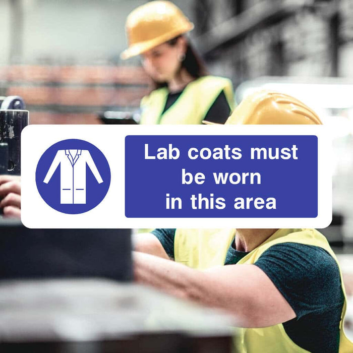This Lab Coats Must Be Worn Sign is designed to clearly remind staff and visitors of the requirement to wear protective lab coats within designated areas. Displaying a bold blue mandatory safety symbol with clear text, the sign helps reduce workplace risks by ensuring compliance with PPE policies. Commonly used in laboratories, cleanrooms, food preparation facilities, and healthcare environments, it provides a clear visual instruction that supports a safe and hygienic working environment.