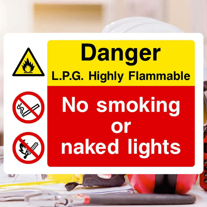 Clearly warn of hazardous gas and smoking restrictions with this LPG Highly Flammable No Smoking Sign. Designed to meet workplace safety standards, this multi-message sign features three key warnings: LPG, highly flammable, and no smoking, helping reduce fire risks around gas storage or refuelling areas. Ideal for industrial, transport, or construction settings where liquefied petroleum gas is present.