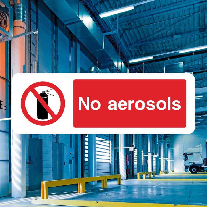 Whether for factories, warehouses, schools, or public spaces, the bold red-and-white design commands attention and helps reduce fire risk associated with aerosol sprays. Available in a range of sizes and mounting options—including self-adhesive, holes, or foam pads—this sign offers versatile installation to suit your setting.