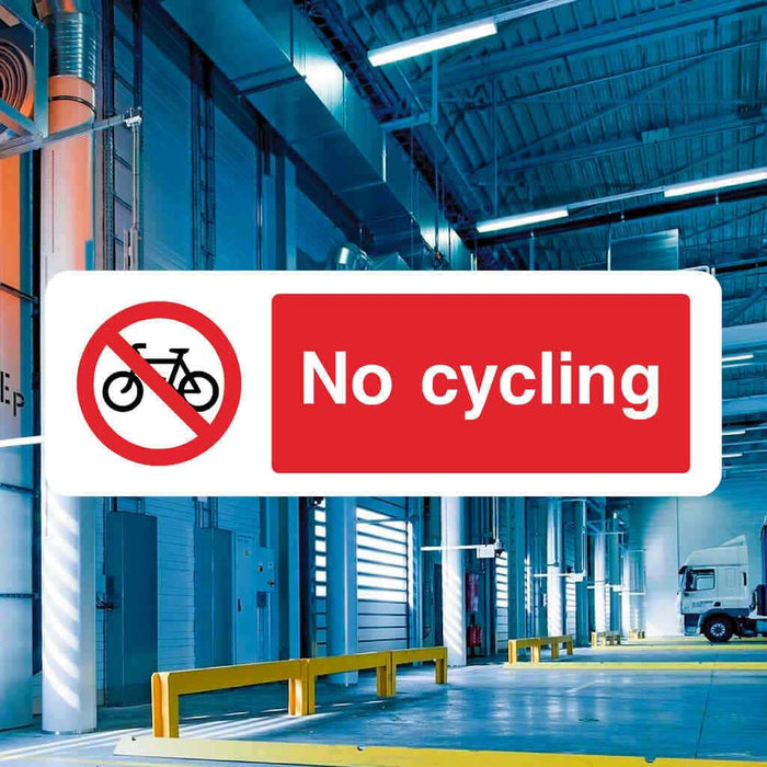 Ensure pedestrian safety with our No Cycling Landscape Sign—a clear and effective prohibition sign designed to prevent cycling in pedestrian zones, footpaths, and safety-critical areas. Featuring a bold black bicycle pictogram within the universally recognised red circle-and-slash, this sign is fully compliant with EN ISO 7010 standards and the Health and Safety (Safety Signs and Signals) Regulations 1996, as enforced by the HSE.