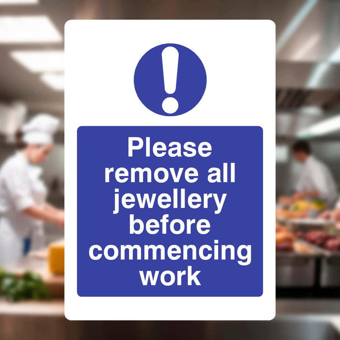 Manufactured in the UK from durable materials, this food hygiene safety sign is suitable for kitchens, restaurants, food factories, and commercial catering areas. It features a bold blue mandatory symbol for maximum visibility and ensures that health and safety procedures are communicated effectively to employees. Installing this jewellery prohibition sign promotes safer working practices, reduces potential hazards, and supports businesses in meeting workplace safety and hygiene legislation.