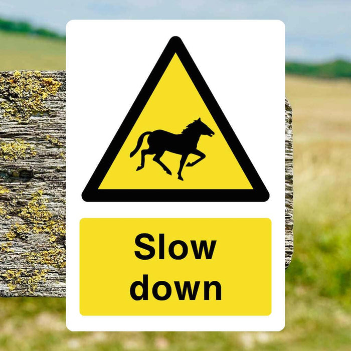 Ensure drivers are alerted to equestrian activity with this Slow Down Horses Sign, ideal for rural roads, bridleways, and farm entrances. Designed to improve road safety where horses and riders are present, this warning sign helps reduce the risk of accidents in countryside areas. Manufactured in the UK from durable, weather-resistant materials, it's available in a choice of sizes and materials, including recyclable aluminium and hard-wearing plastic. The bold text and clear layout ensure high visibility, even in poor weather. Fixing options include pre-drilled holes for posts or fences, suitable for farms, livery yards, and private estates. Supports awareness of vulnerable road users in line with Highway Code guidance. Popular with rural property owners, horse riders, and agricultural businesses looking to enhance on-site safety.
