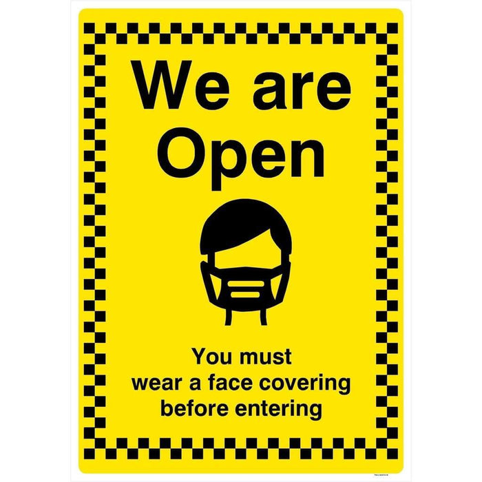 Shop for a We Are Open Face Covering Must Be Worn Sign, part of our extensive range of virus signs designed to help prevent the risk of infection. With this sign prominently displayed, you can ensure that both your staff and members of the general public are protected by wearing well-fitted face masks and face coverings.